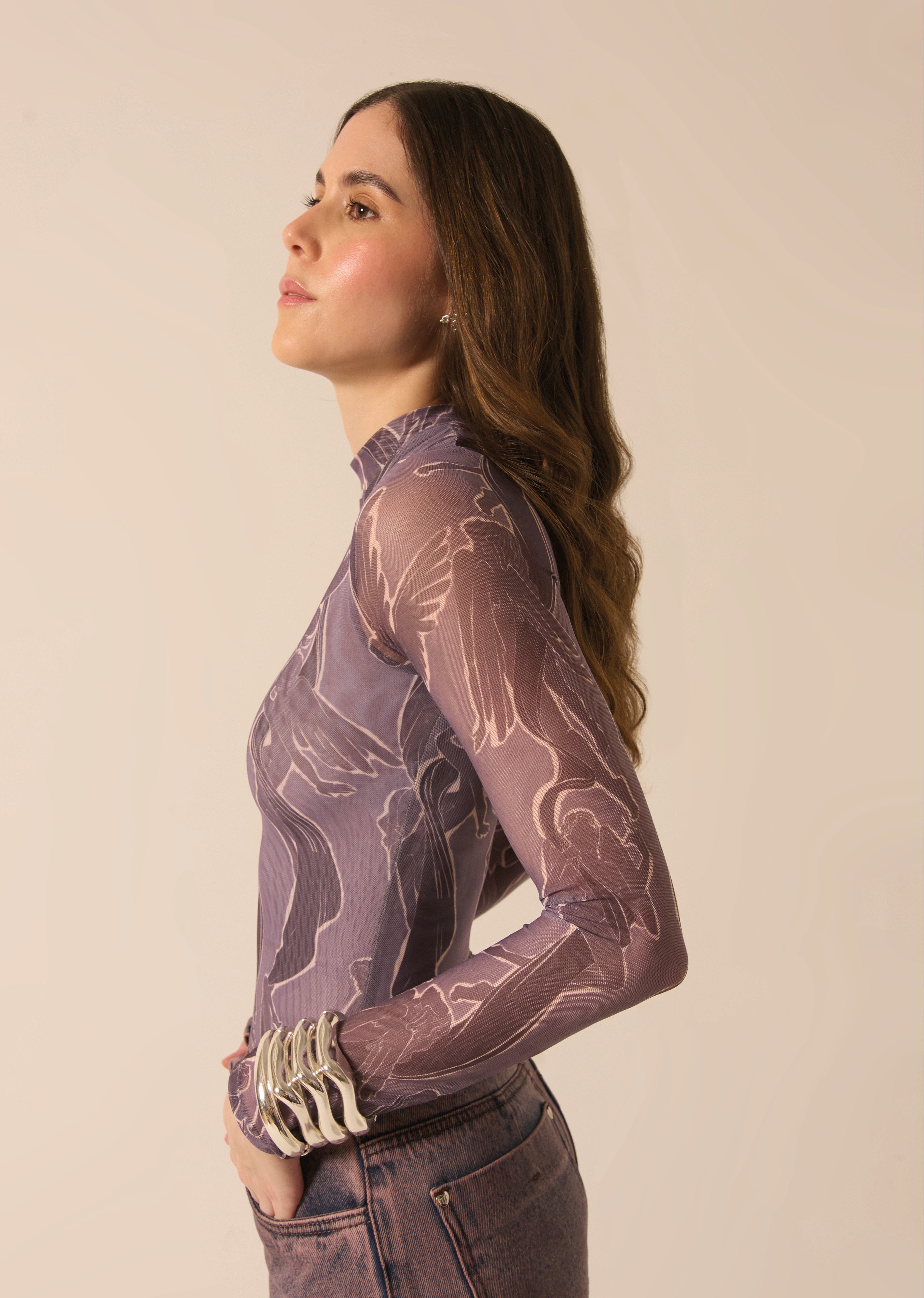 Nuestro body insignia ahora con print de angeles inspirado en nuestro sisTER(S)hood. Body con broches en la entrepierna para más comodidad, manga larga y cuello alto, esta hecho de mesh sublimado con elonganción. La modelo utiliza talla XS, estatura: 1.74.