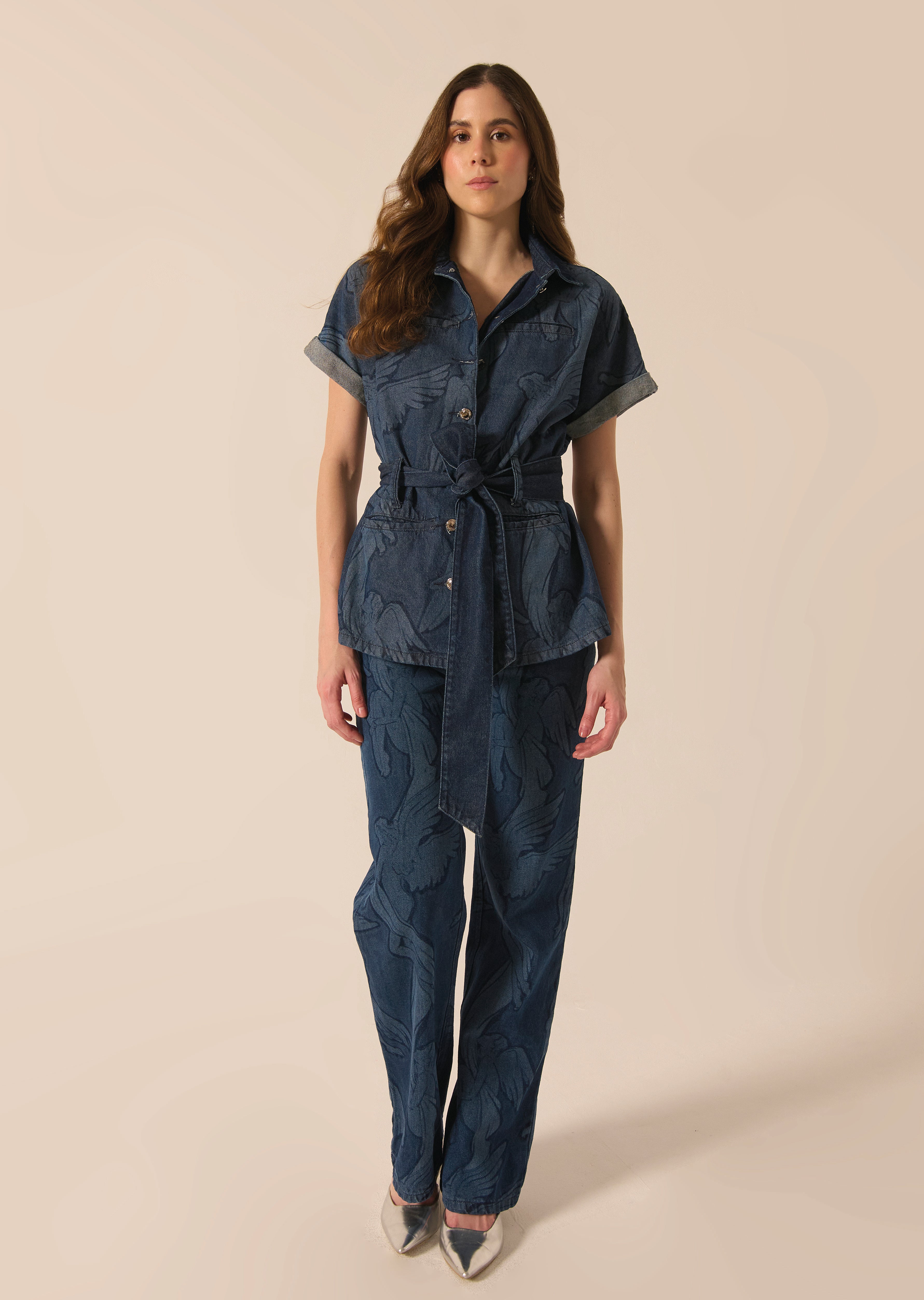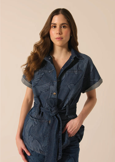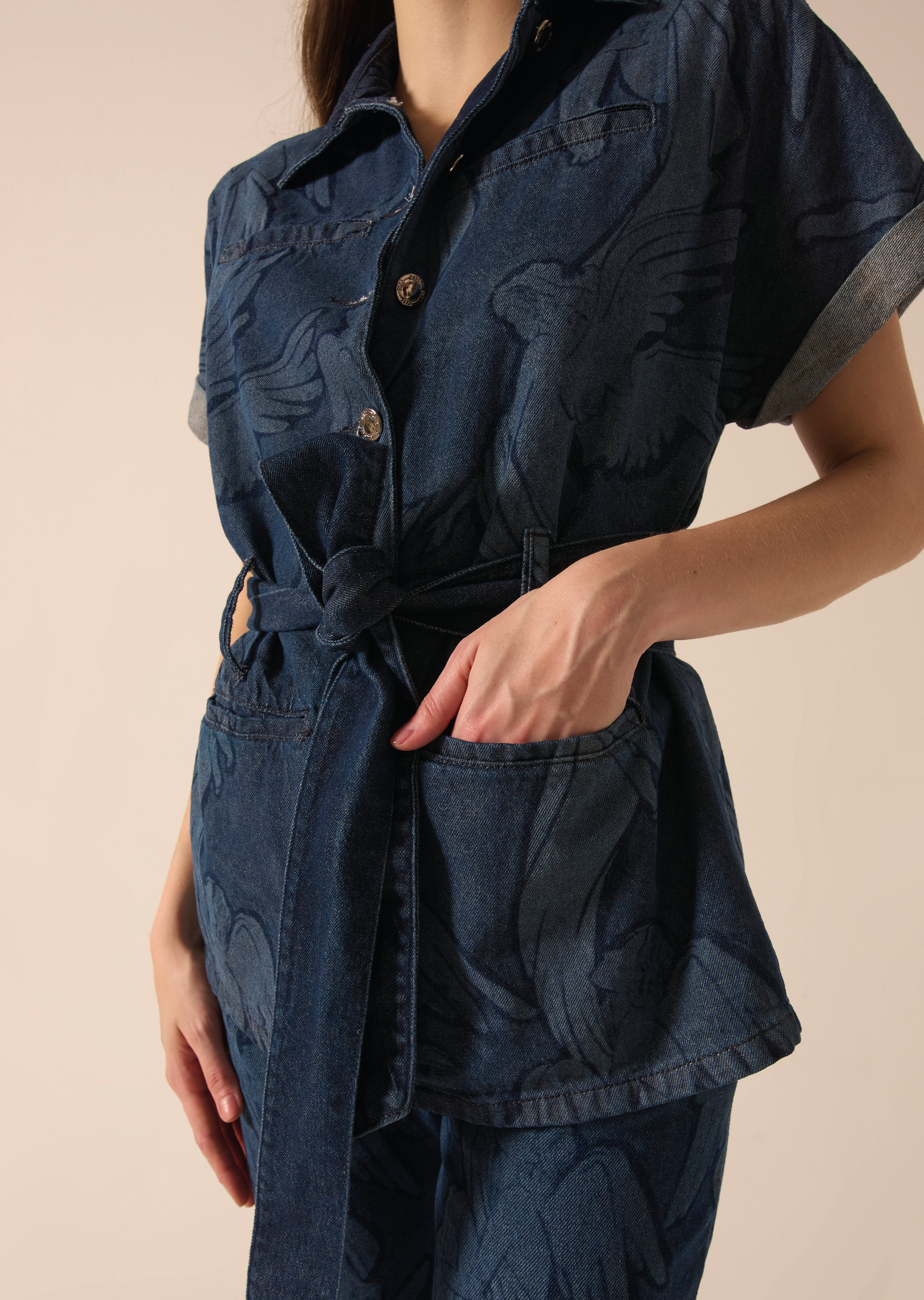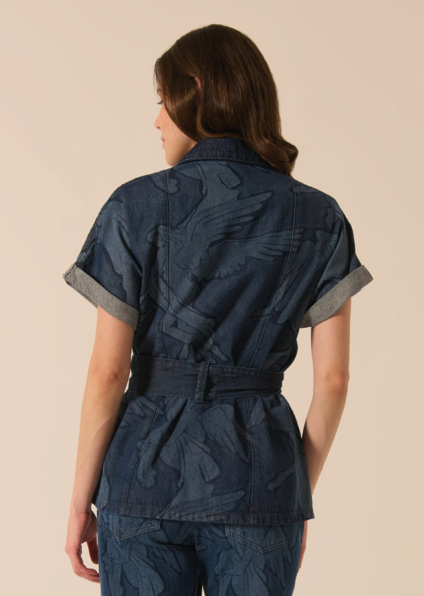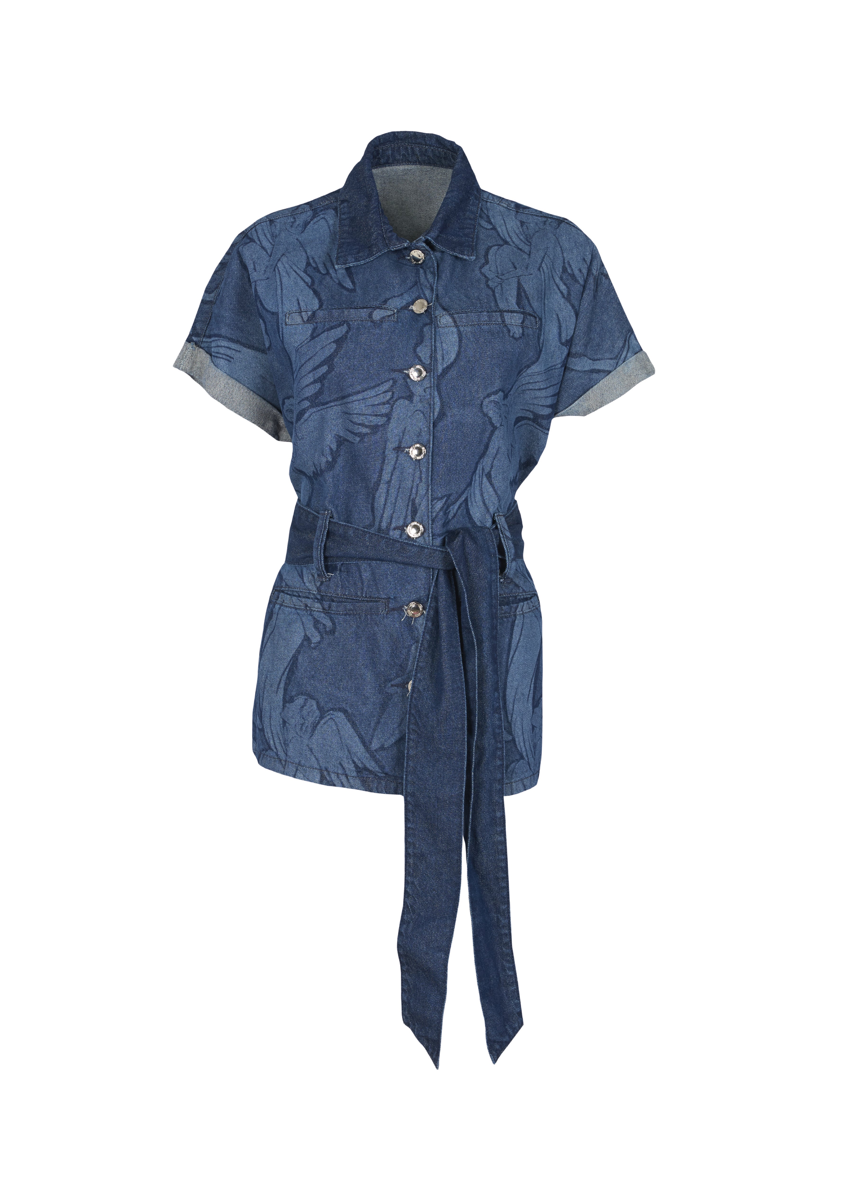 El denim que conoces, elevado. Camisa azul oscuro con diseño de ángeles grabado con láser que le da un vibe único. Incluye un fajón para amarrar en la cintura que te permite estilizar la silueta a tu gusto. Es la pieza statement perfecta: versátil, cómoda y con una vibra celestial. Modelo usa talla SM, mide 1,74.