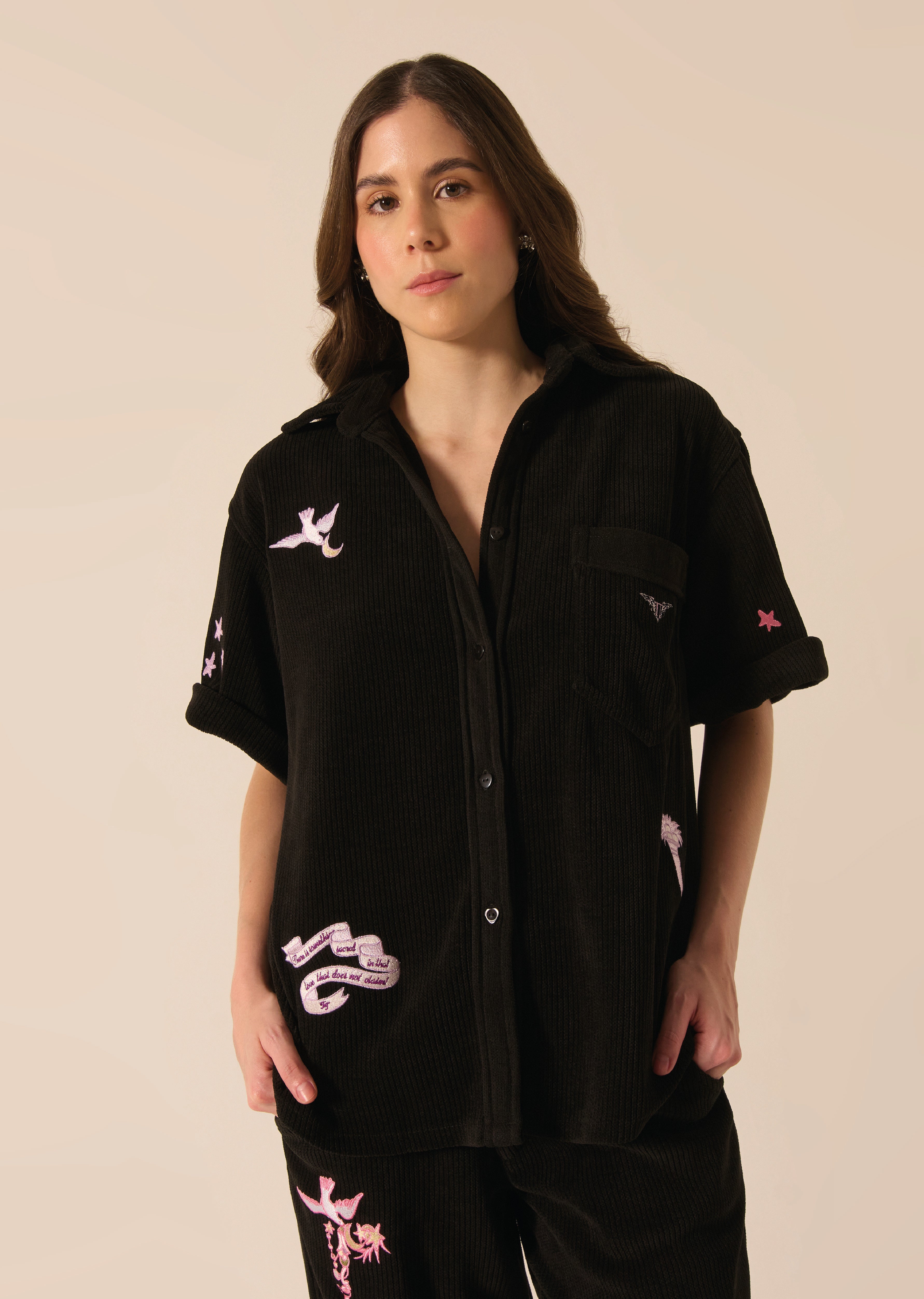 Esta camisa está confeccionada en una tela comfy con caída única y un vibe casual, pero intencionado. Tiene una silueta definida y estructurada sin esfuerzo, combinando confort y estilo. Los delicados bordados y su botonadura de corazones le añaden un detalle único y exclusivo que la diferencia del resto. Una prenda súper versátil, perfecta para esos días en los que quieres sentirte cómoda sin sacrificar tu estilo. La modelo usa talla SM.