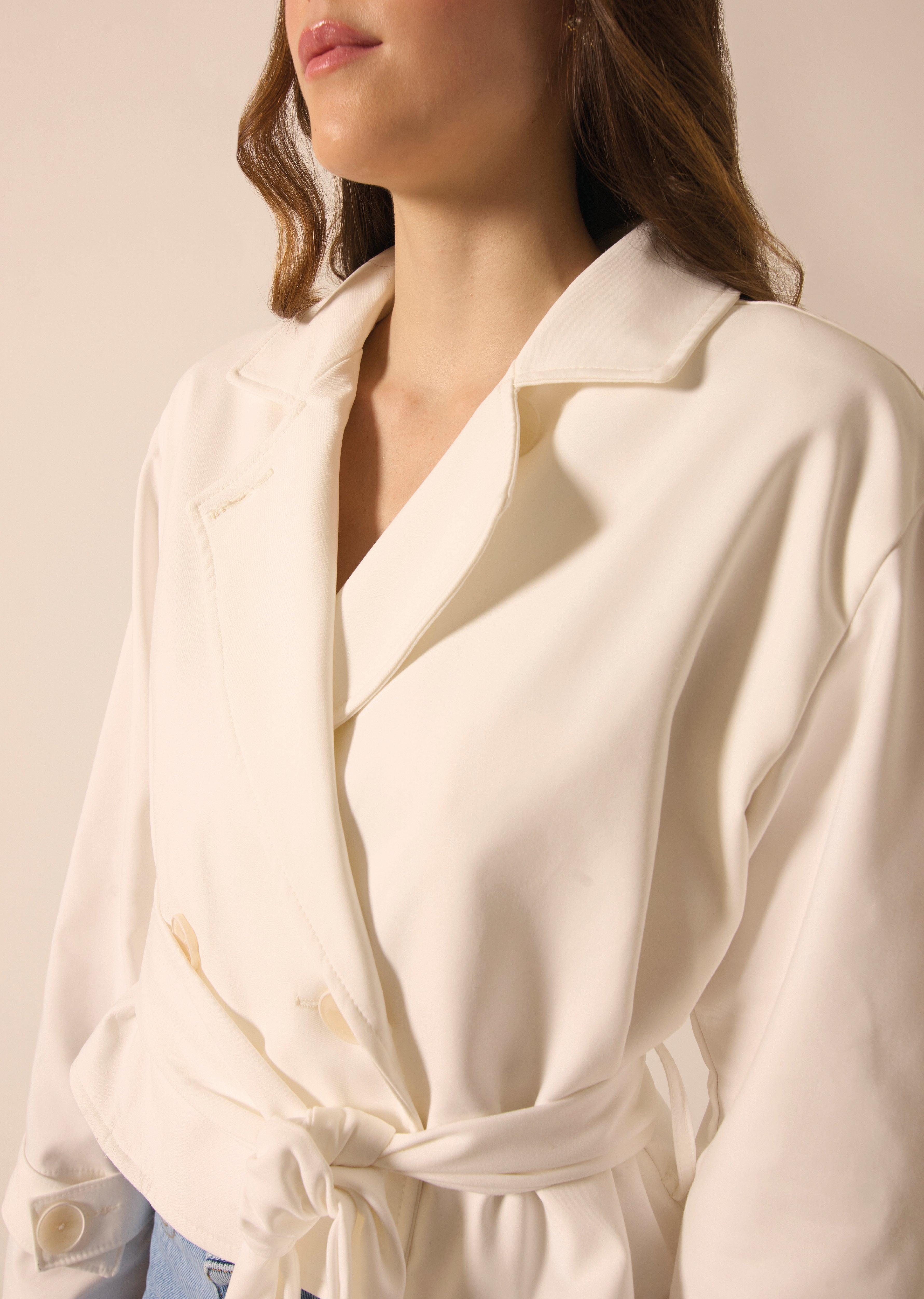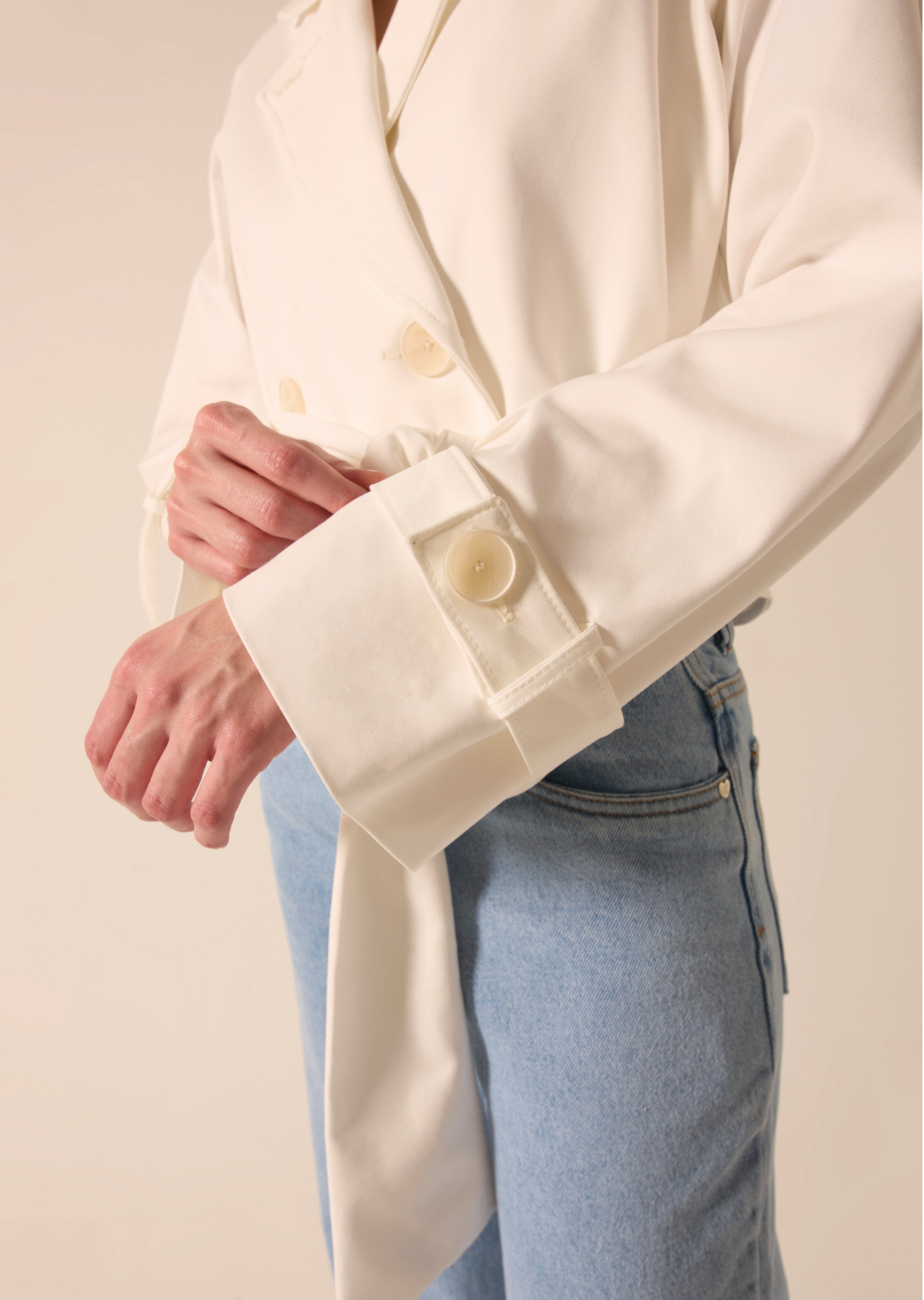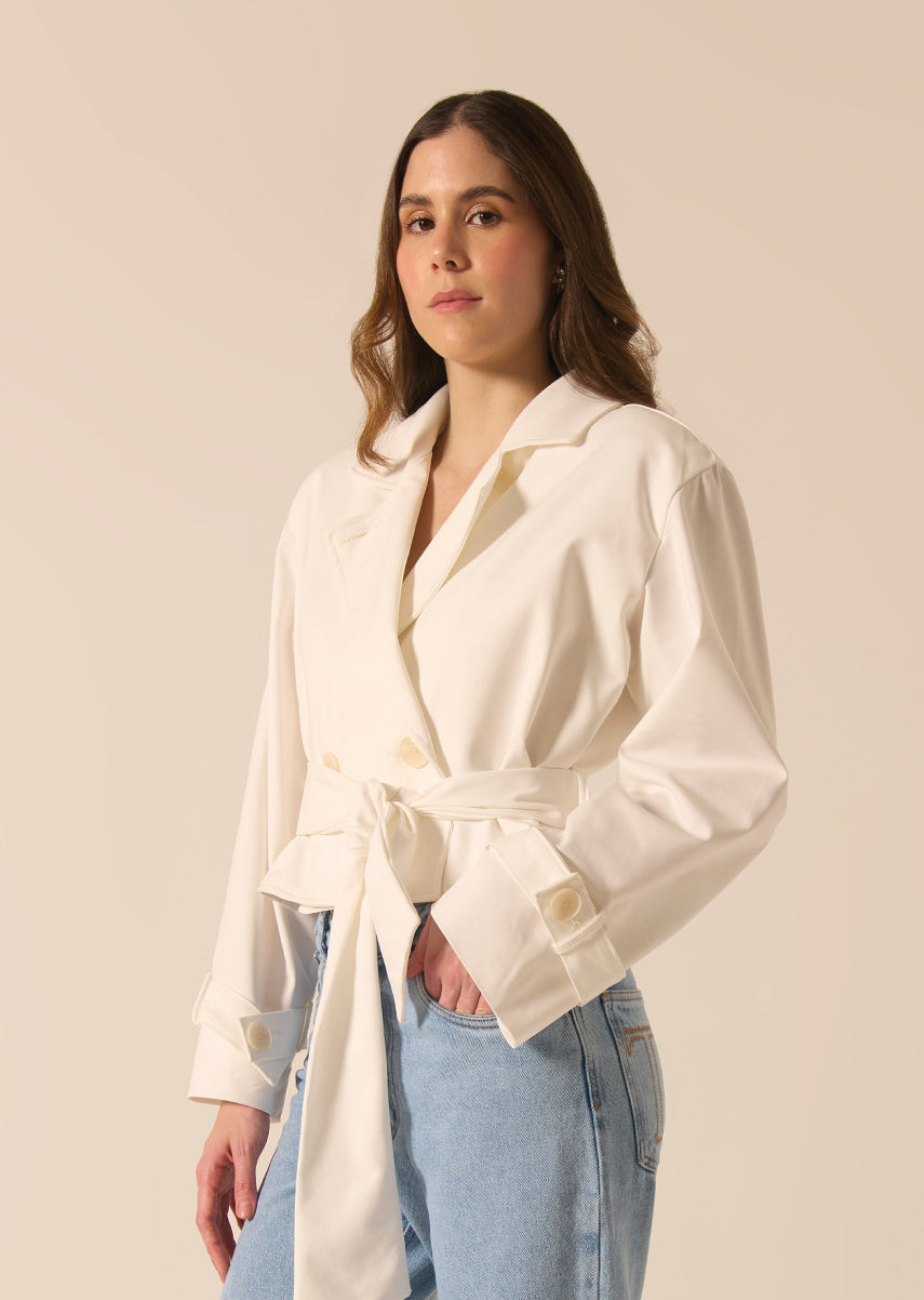 Hemos tomado el clásico trench coat y lo hemos reinventado en un corte cropped, perfecto para hacer layering. Su silueta versátil y sus correas añaden estructura y versatilidad. Llévalo abierto para un vibe casual o abrochado para un look más pulido y sofisticado. La modelo usa talla SM.