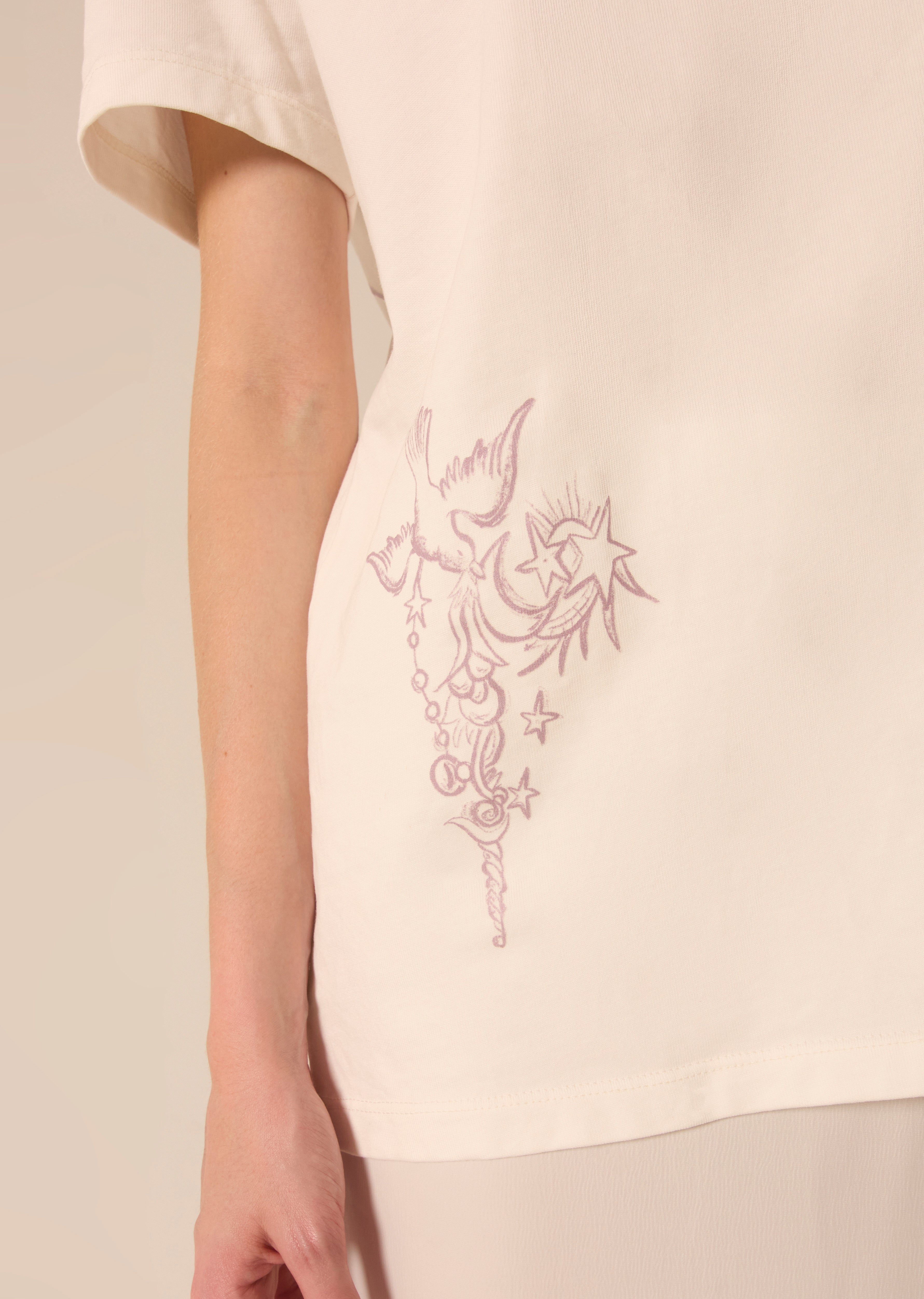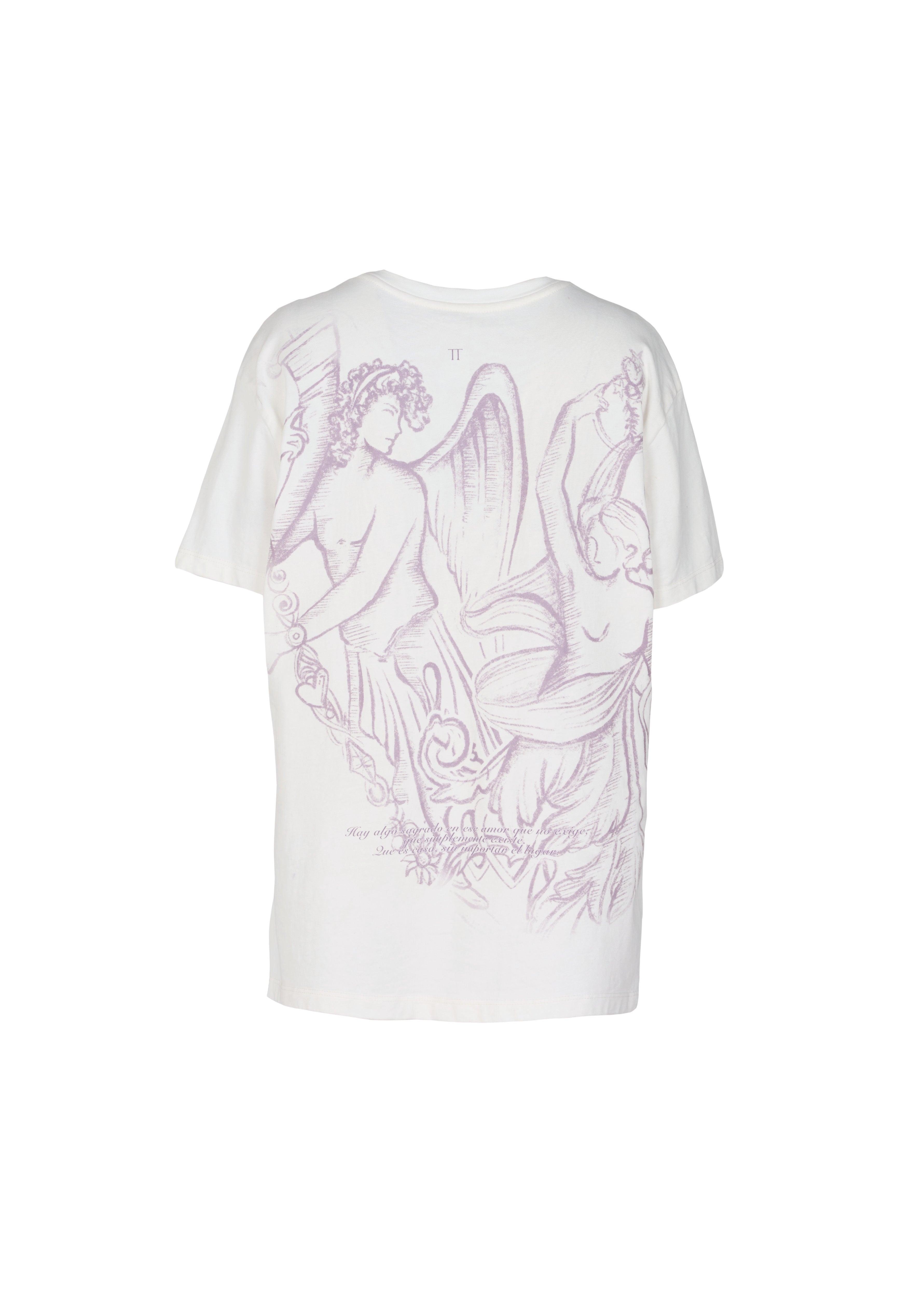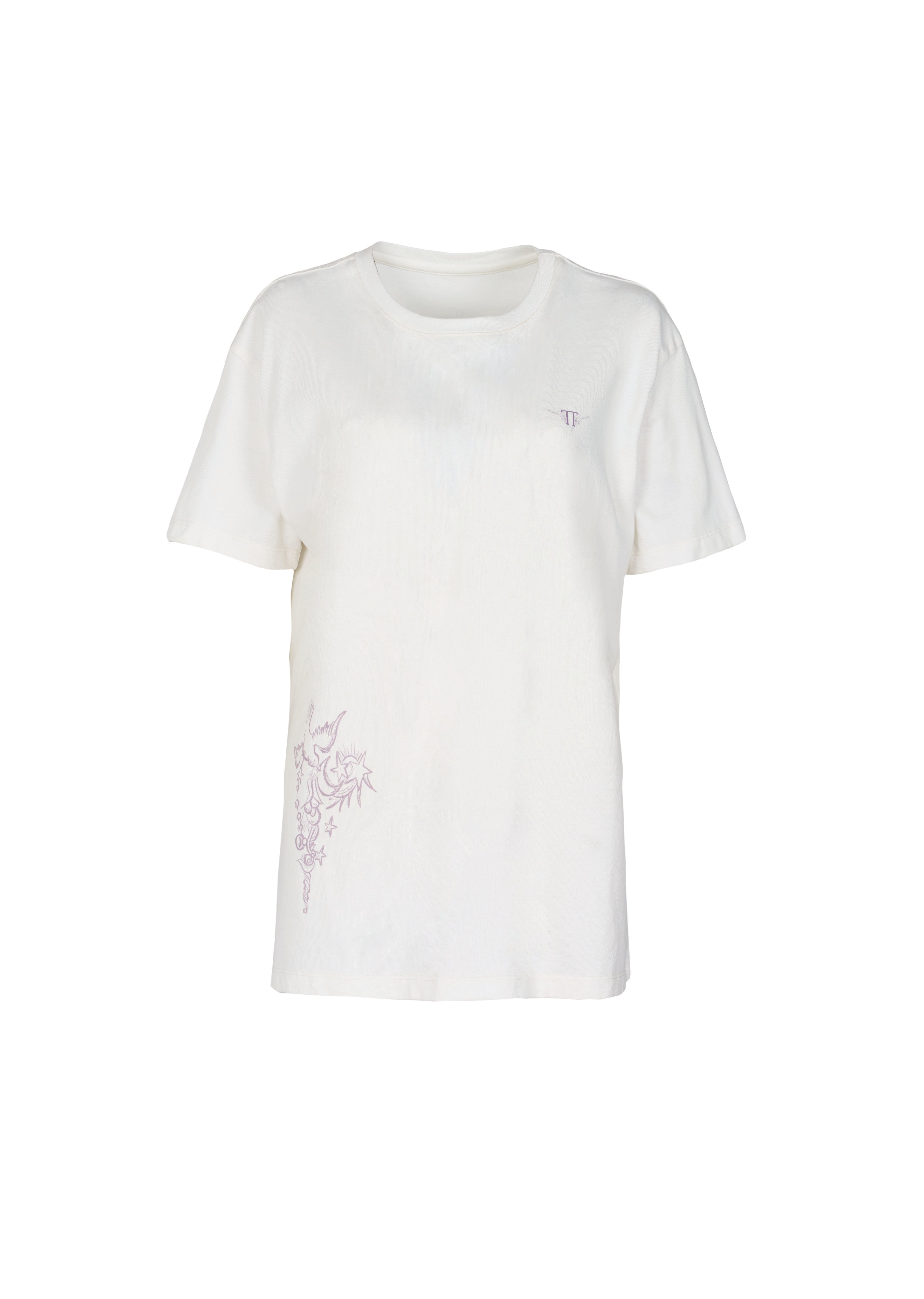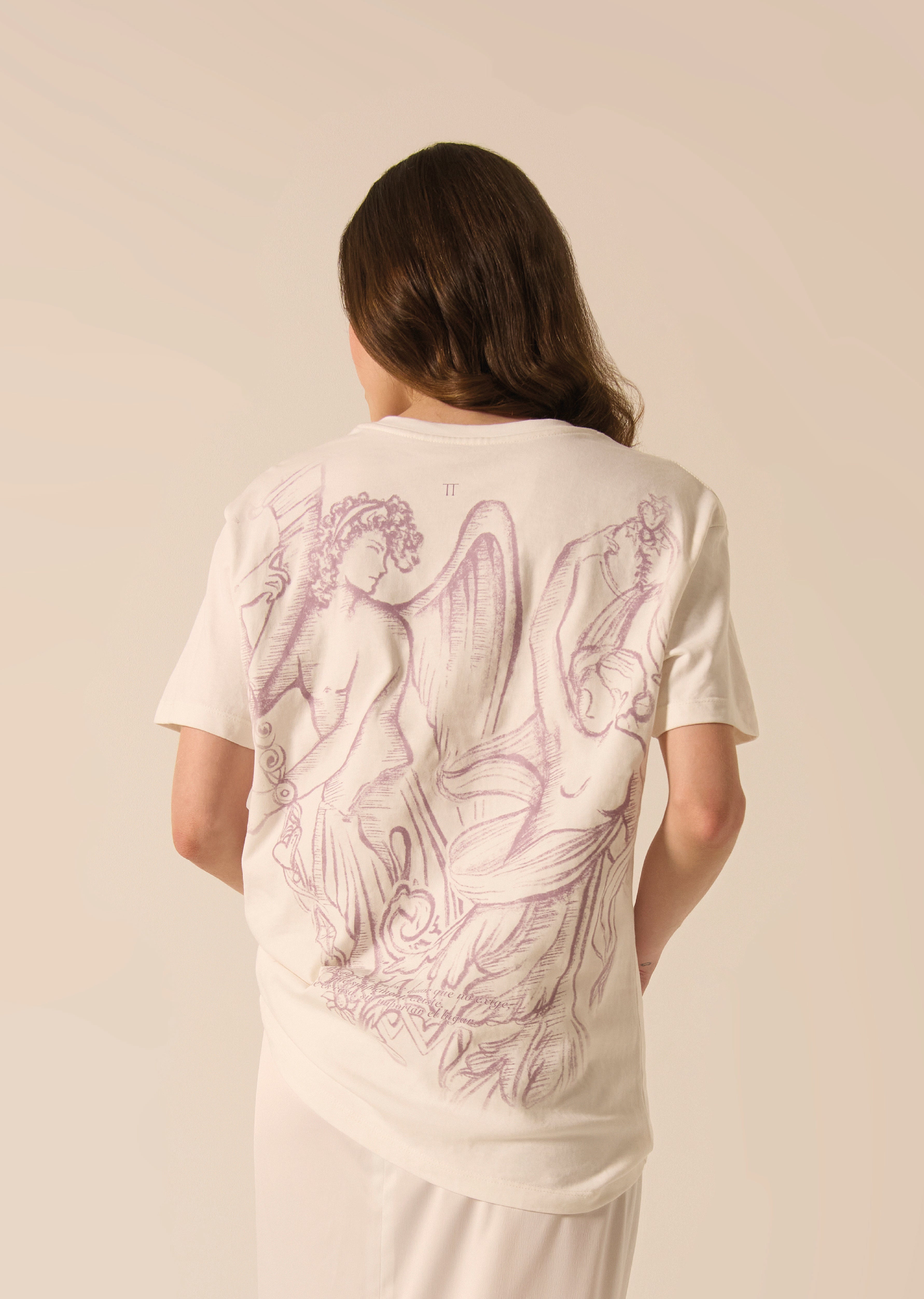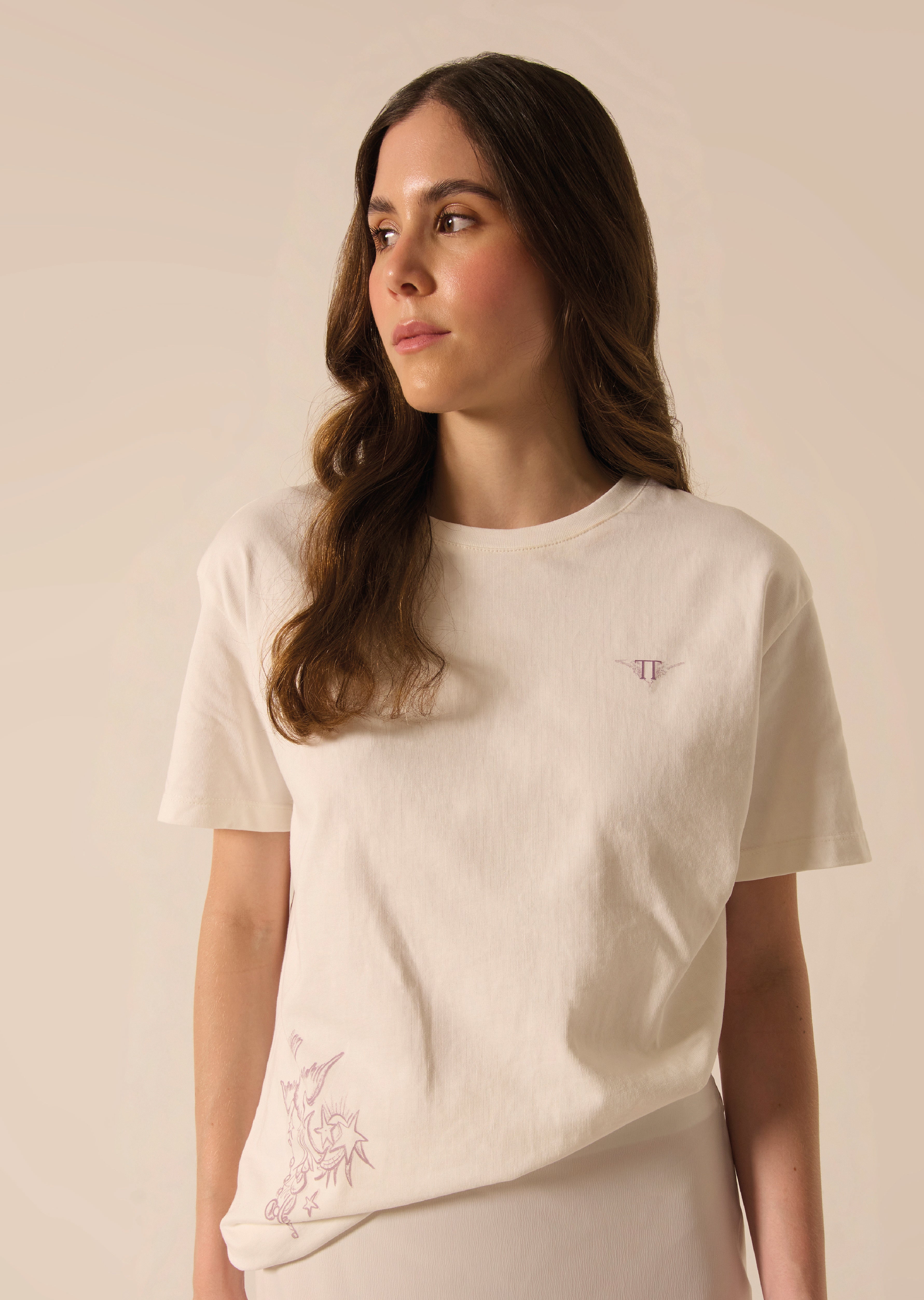 Camiseta oversized unisex, hecha en la tela insignia de TERS, 100% algodón , cuello redondo, cómoda y cool con un print sagrado de colección en su posterior. La modelo usa talla SM