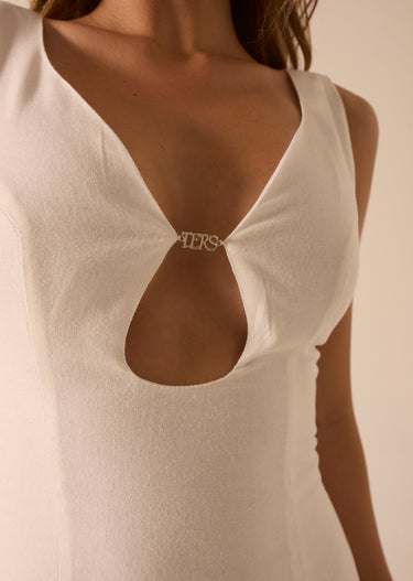 Un vestido ajustado al cuerpo con un escote pronunciado y placa metálica al hilo del isotipo de la marca en el centro. Tiene cierre posterior y un diseño que resalta por los cortes y los acabados. Perfecto para tardes largas, cenas al aire libre y todo lo que el verano italiano trae consigo.