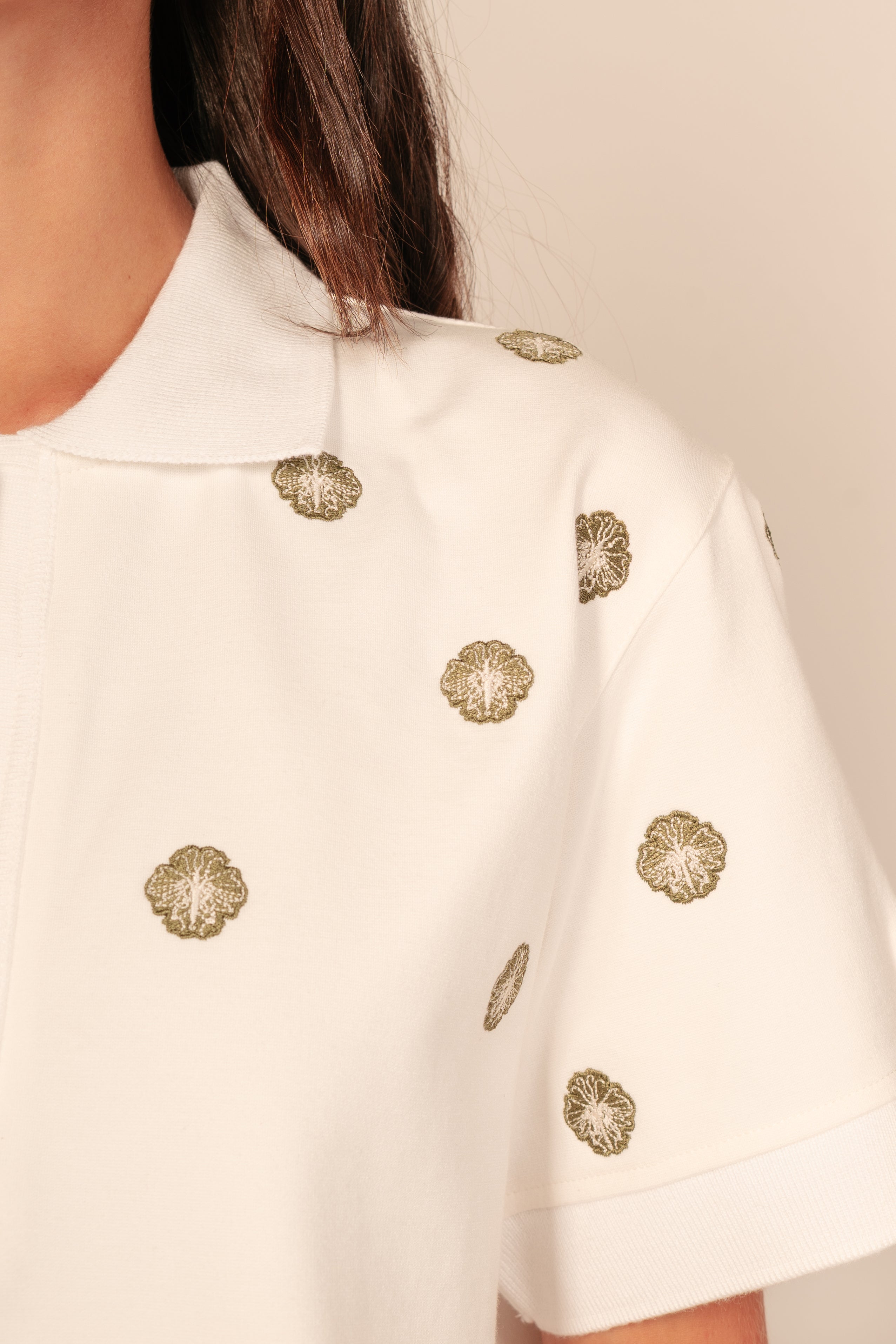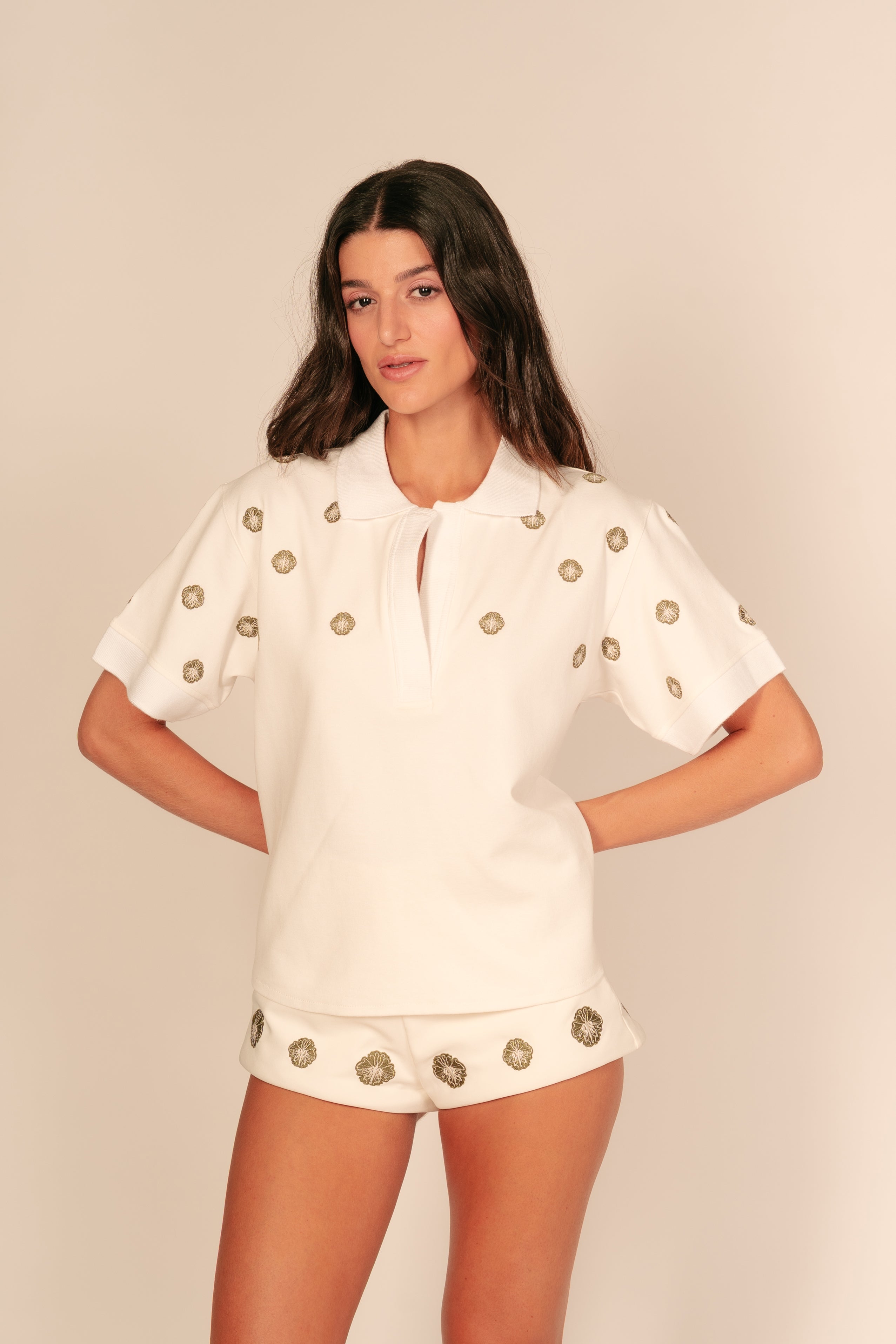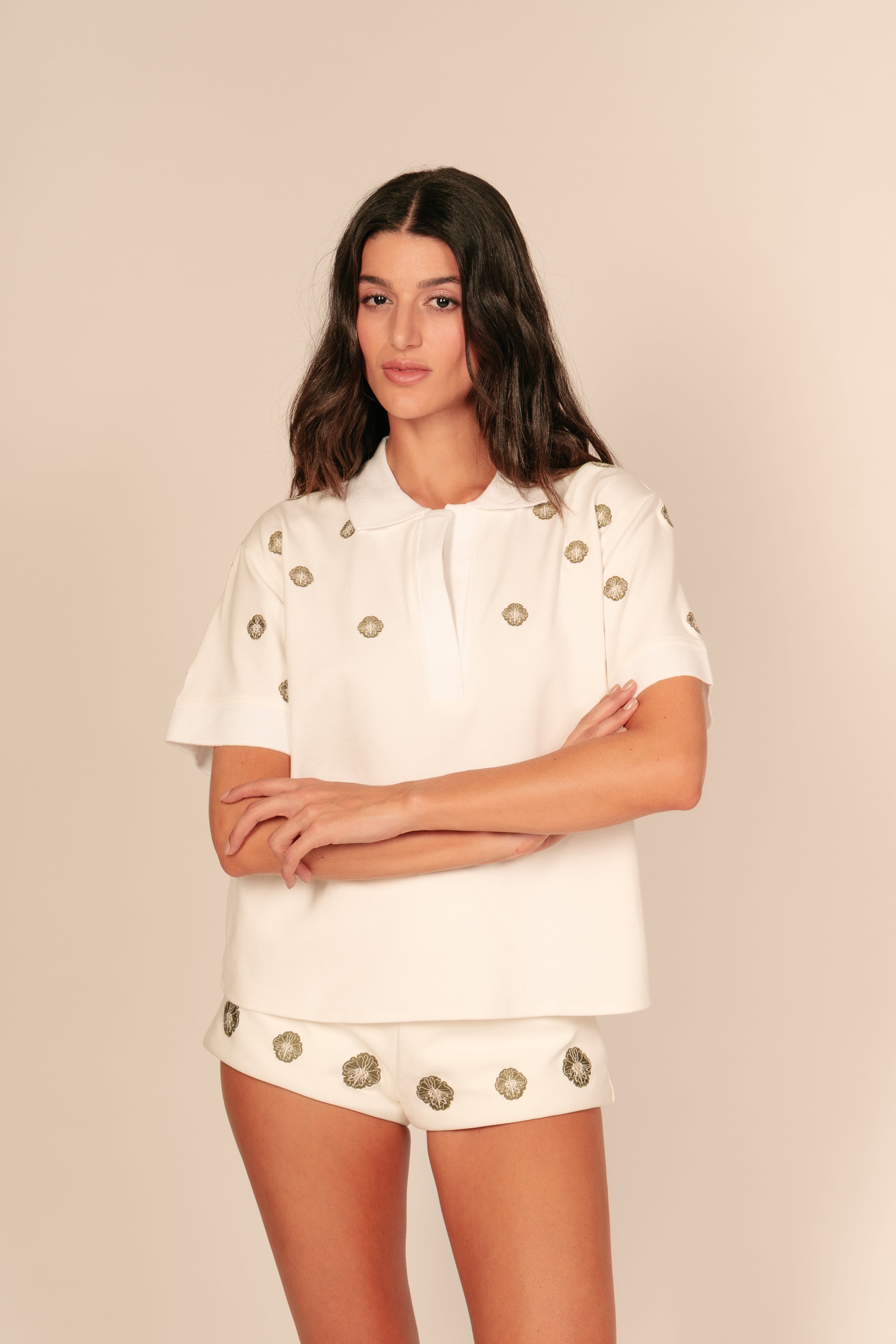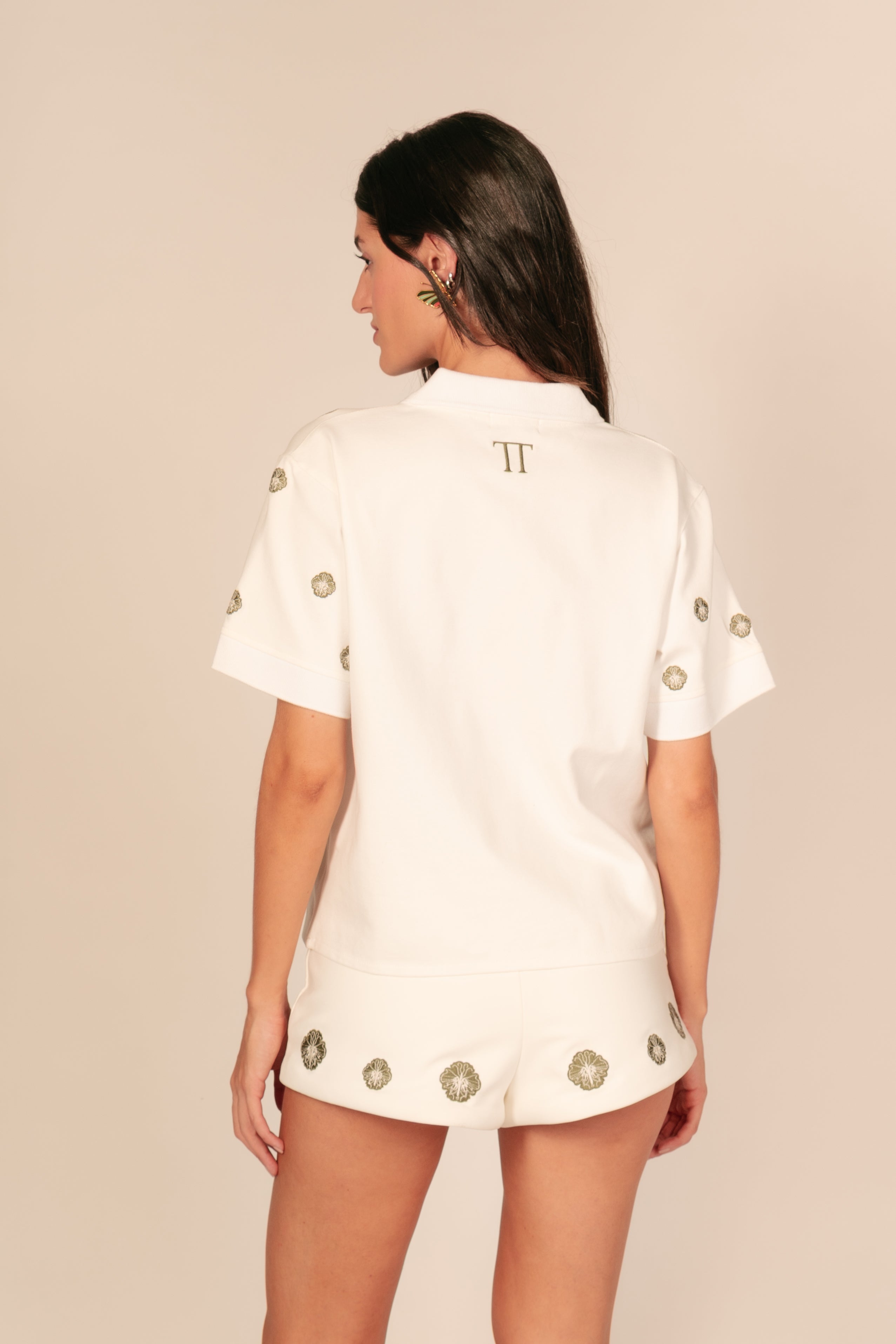 La Gaia Polo conserva nuestra característica horma, clásica pero con ese toque cool en bordado de flores y mariposas. Confeccionada en algodón premium, ofrece estructura, comodidad y un acabado impecable. Una pieza esencial para que sumes a tu coleccion. La modelo utiliza talla S-M.