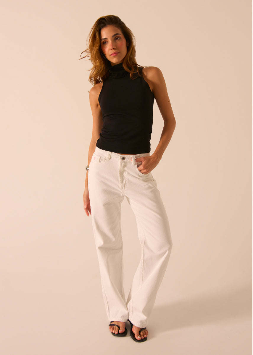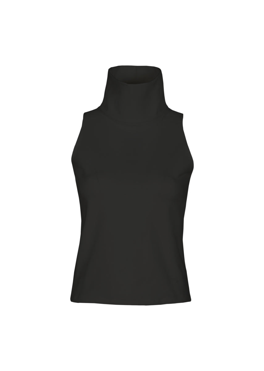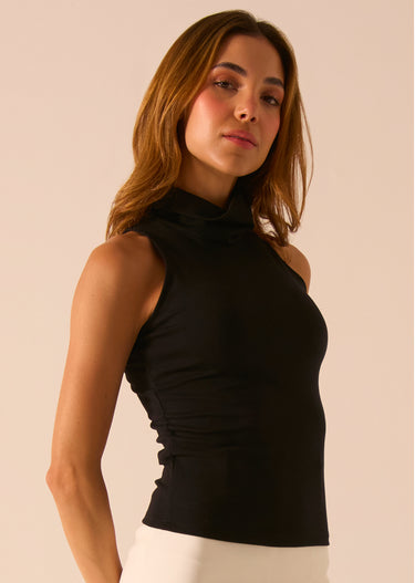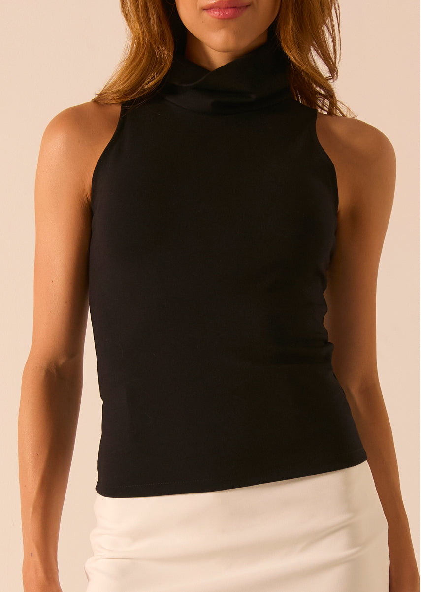 Top sin mangas de silueta ajustada con cuello tortuga estructurado que equilibra elegancia y frescura. Su diseño limpio y largo versátil lo convierten en una pieza atemporal que se adapta con facilidad a looks minimalistas o estilismos más sofisticados. Confeccionado en tela Campoleone, aporta estructura y confort a cualquier ocasión.