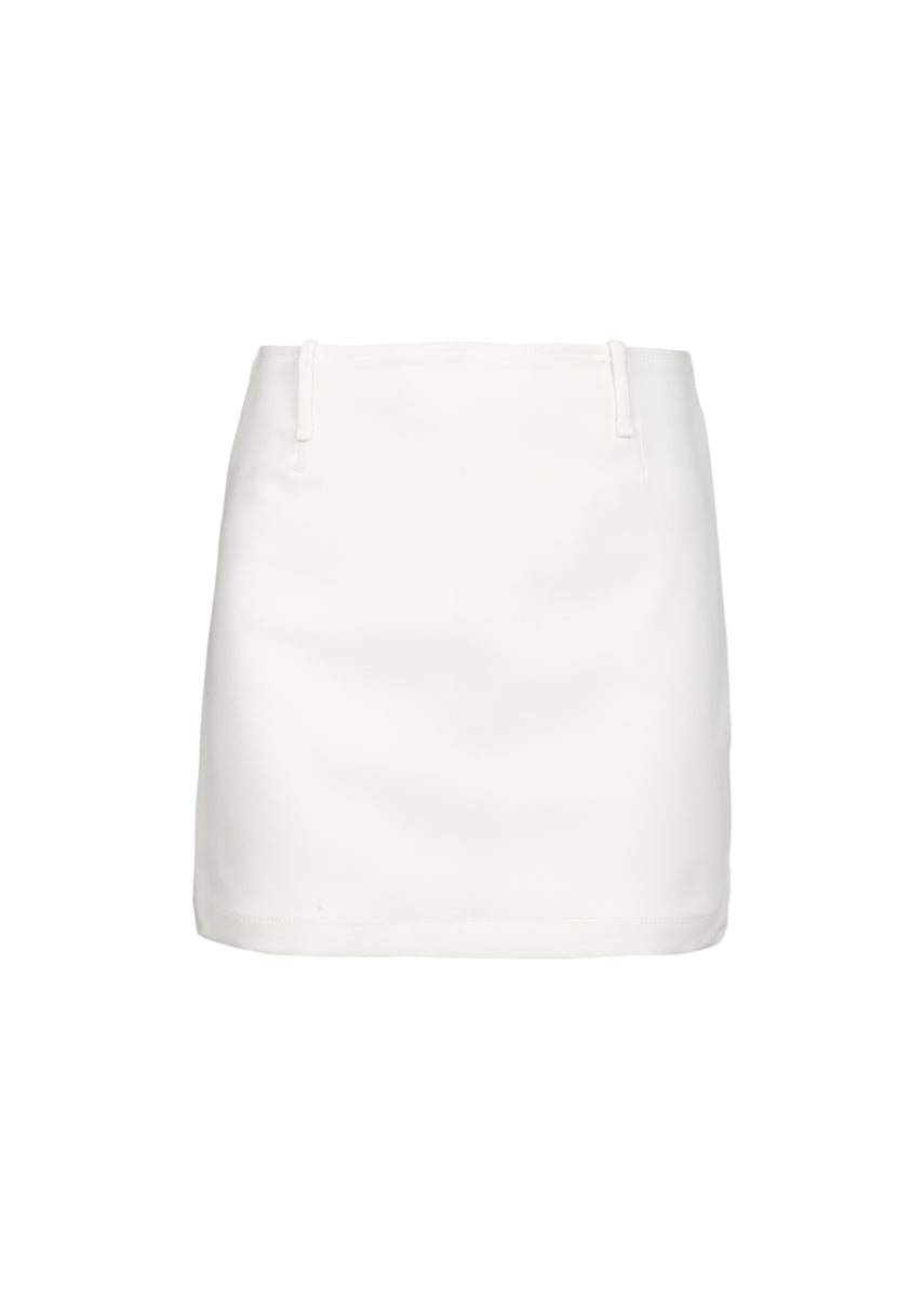Falda short que actualiza el clásico mini con un tiro alto que con pinzas posteriores que garantizan un fit anatómico. Su cierre semi invisible y los pasadores