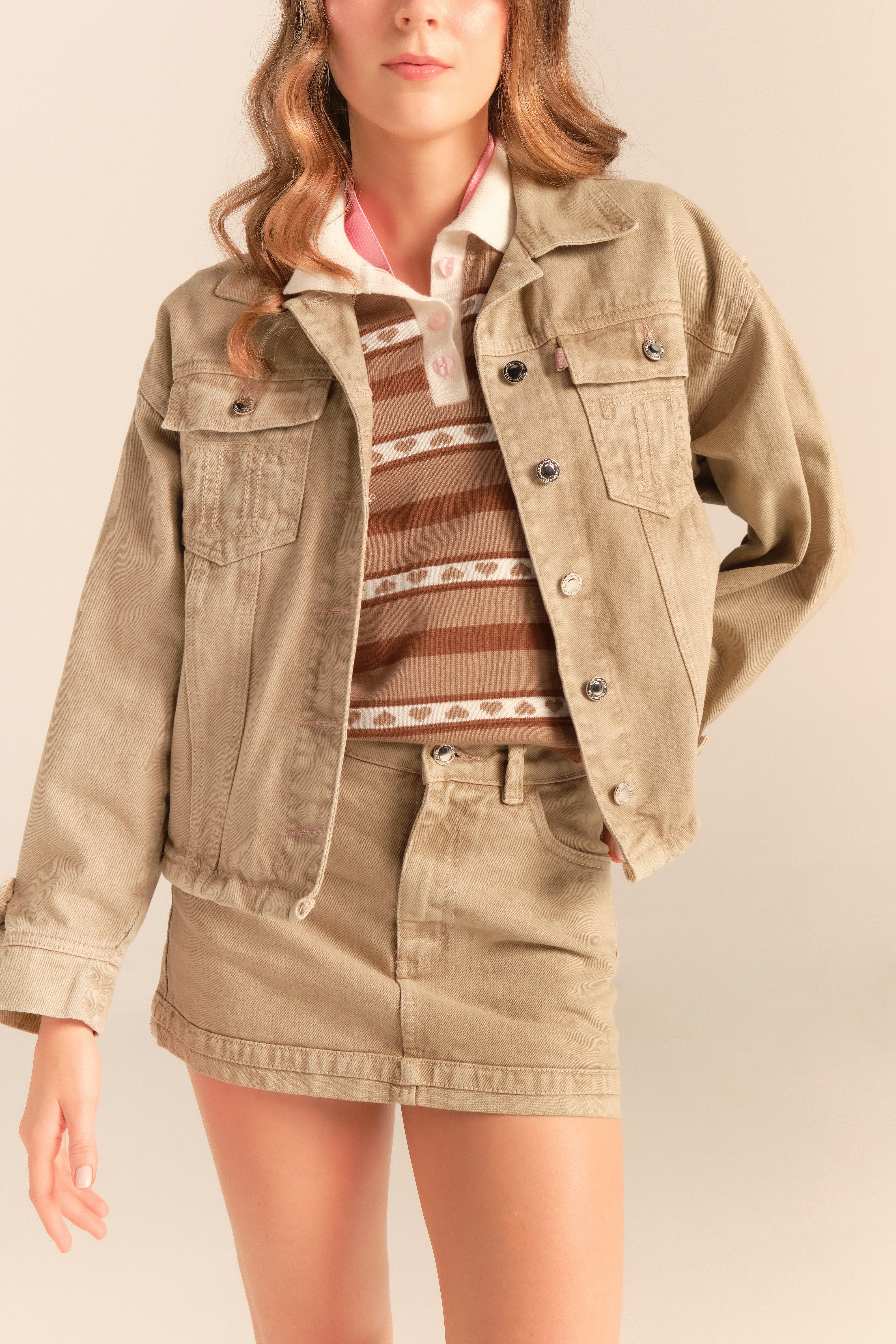 Nuestra nueva chaqueta en denim color mocca es un must! Su silueta es semi cropped y tiene un ajuste en mangas que la hace increíblemente versátil, funcional y fácil de adaptar a distintos estilos. Su tono mocca, neutro y atemporal, permite integrarla sin esfuerzo al armario y combinarla con una amplia gama de colores, algo para resaltar el contraste, los pespuntes de toda la chaqueta en color rosa pastel.